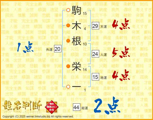 駒木根栄一さんの総運は44画の2点!