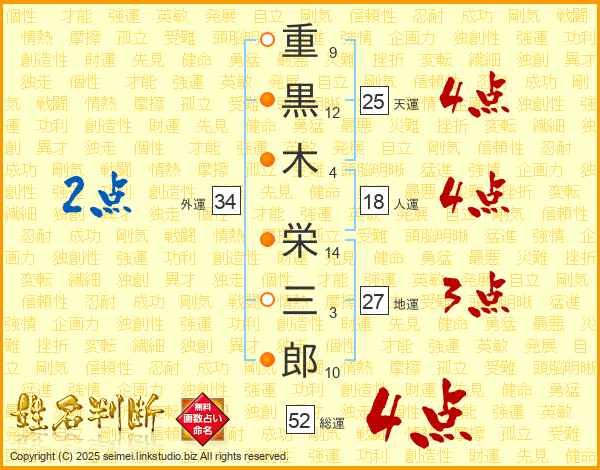 重(9画)黒(12画)木(4画) 栄(14画)三(3画)郎(10画)