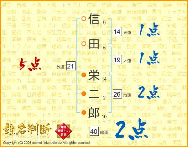信(9画)田(5画) 栄(14画)二(2画)郎(10画)
