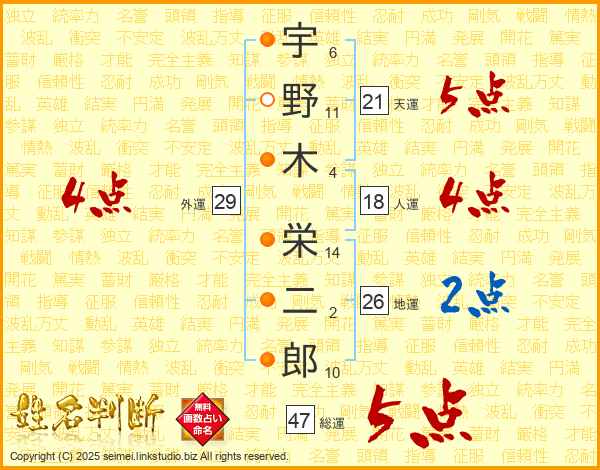 宇野木栄二郎さんの総運は47画の5点!