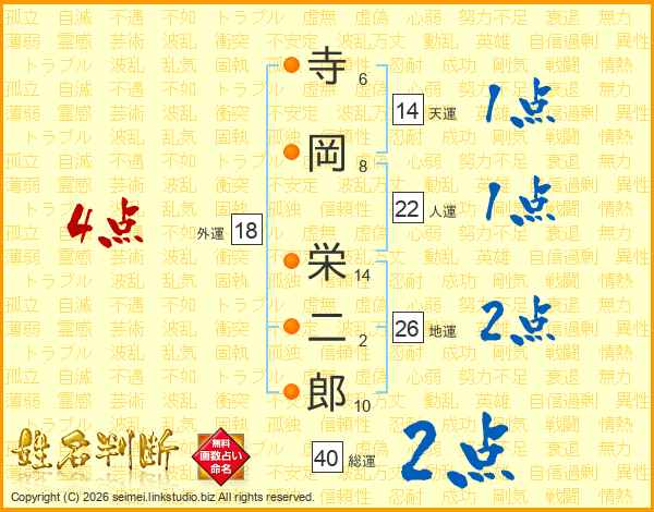寺(6画)岡(8画) 栄(14画)二(2画)郎(10画)