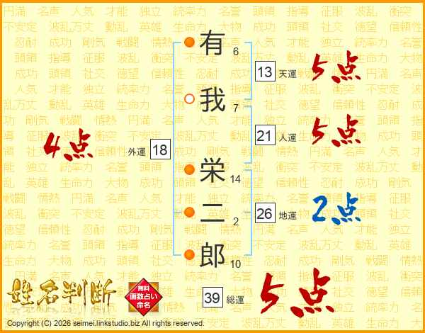 有我栄二郎さんの総運は39画の5点!