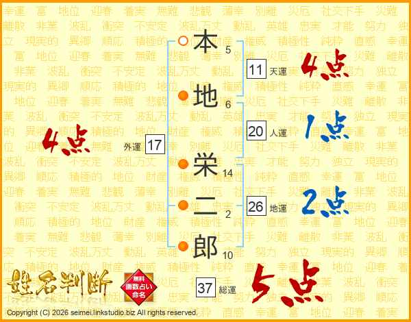 本(5画)地(6画) 栄(14画)二(2画)郎(10画)