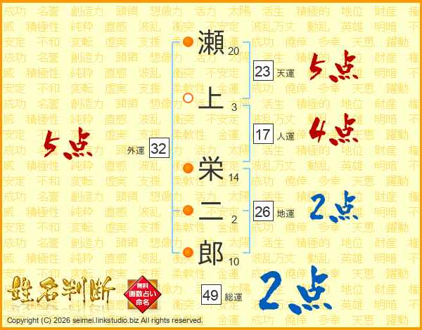 瀬(20画)上(3画) 栄(14画)二(2画)郎(10画)