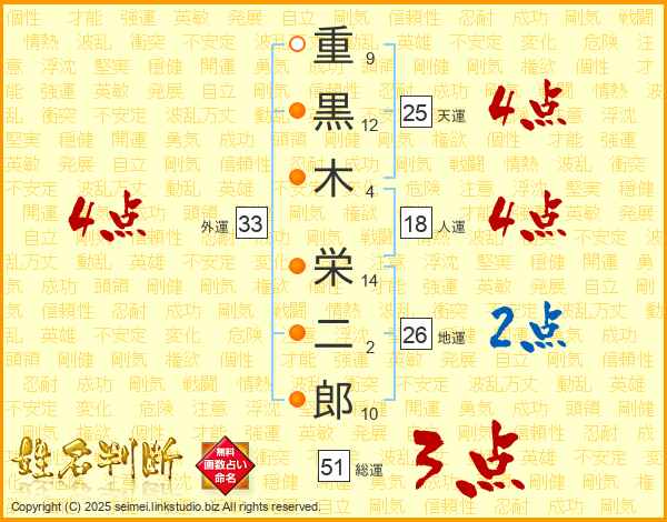 重(9画)黒(12画)木(4画) 栄(14画)二(2画)郎(10画)