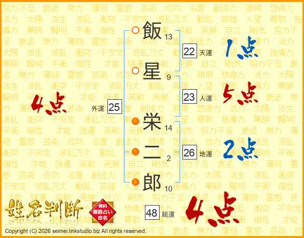 飯(13画)星(9画) 栄(14画)二(2画)郎(10画)