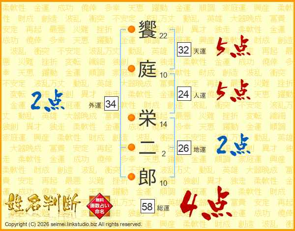 饗庭栄二郎さんの総運は58画の4点!