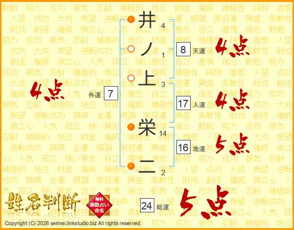 井(4画)ノ(1画)上(3画) 栄(14画)二(2画)