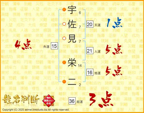 宇佐見栄二さんの総運は36画の3点!