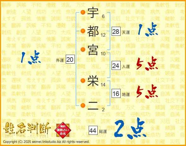 宇(6画)都(12画)宮(10画) 栄(14画)二(2画)