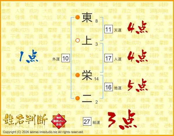 生活面を象徴する運勢です。外部から受ける影響力を表し、結婚運、家庭運や職場、環境への順応性を表します。総運から人運を引いた画数。姓や名が1文字の場合を除く。