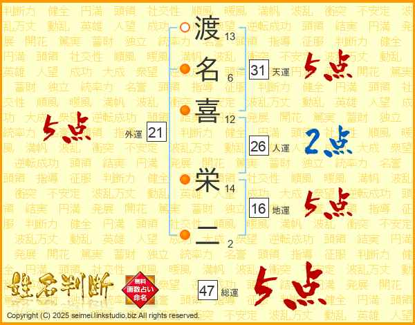 渡(13画)名(6画)喜(12画) 栄(14画)二(2画)