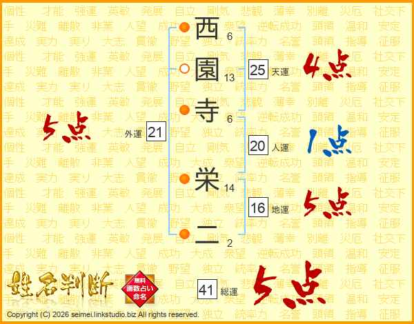 西園寺栄二さんの総運は41画の5点!