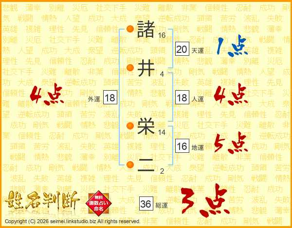 あなたの人生を表す1番重要な運勢です。生涯を通じて影響する総合運となり、主に50歳以降の晩年期に影響を及ぼします。苗字と名前の合計画数。