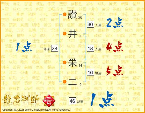 生活面を象徴する運勢です。外部から受ける影響力を表し、結婚運、家庭運や職場、環境への順応性を表します。総運から人運を引いた画数。姓や名が1文字の場合を除く。
