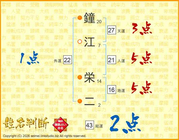 鐘(20画)江(7画) 栄(14画)二(2画)
