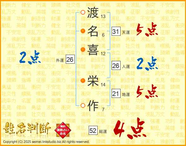 渡(13画)名(6画)喜(12画) 栄(14画)作(7画)