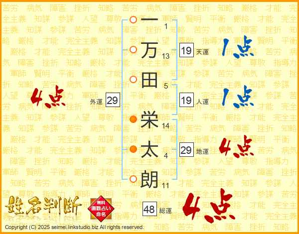 一(1画)万(13画)田(5画) 栄(14画)太(4画)朗(11画)