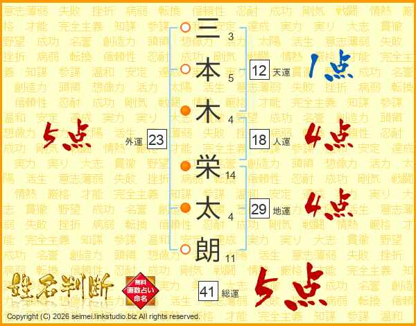 三(3画)本(5画)木(4画) 栄(14画)太(4画)朗(11画)