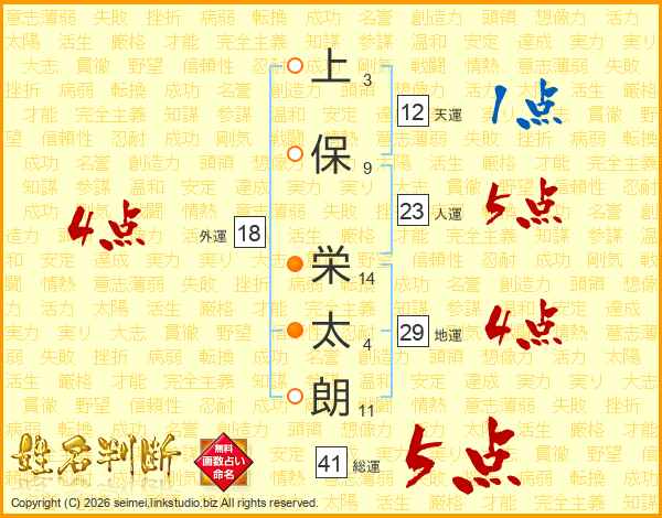 上(3画)保(9画) 栄(14画)太(4画)朗(11画)