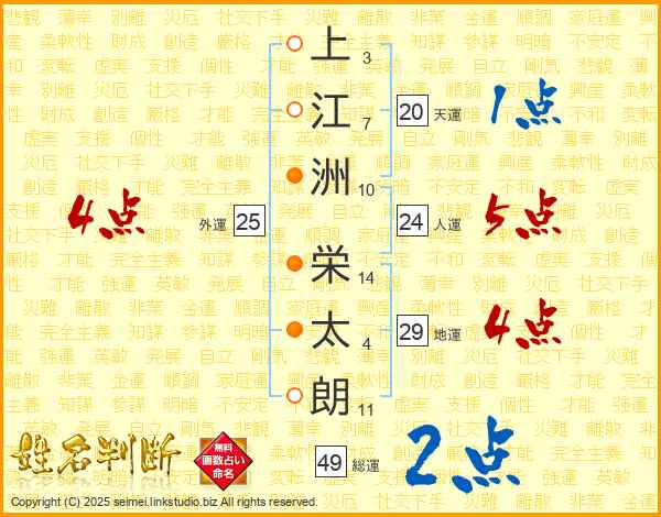 上(3画)江(7画)洲(10画) 栄(14画)太(4画)朗(11画)