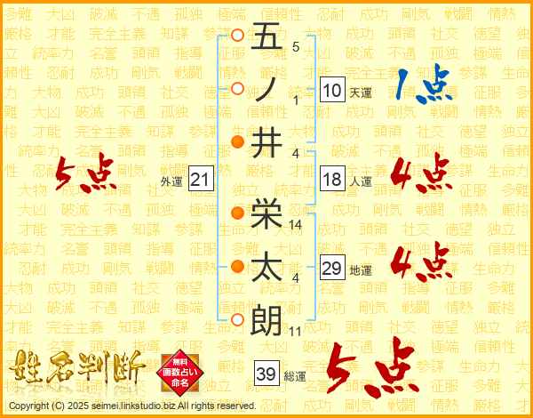 五(5画)ノ(1画)井(4画) 栄(14画)太(4画)朗(11画)