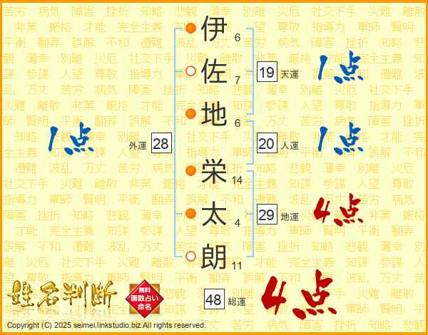 伊(6画)佐(7画)地(6画) 栄(14画)太(4画)朗(11画)