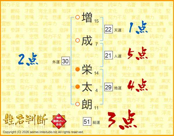 増(15画)成(7画) 栄(14画)太(4画)朗(11画)