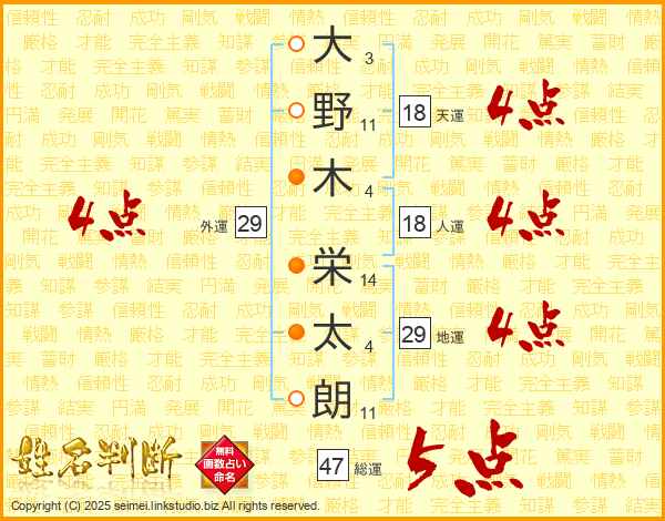大(3画)野(11画)木(4画) 栄(14画)太(4画)朗(11画)