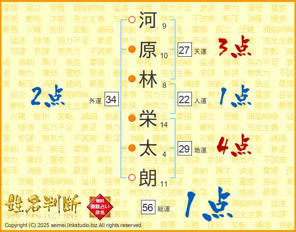 河(9画)原(10画)林(8画) 栄(14画)太(4画)朗(11画)