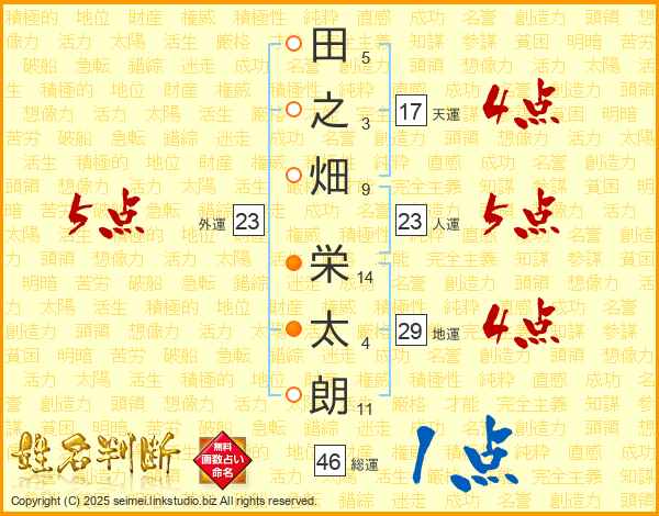 田(5画)之(3画)畑(9画) 栄(14画)太(4画)朗(11画)
