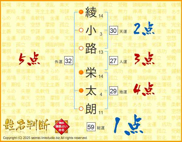 綾(14画)小(3画)路(13画) 栄(14画)太(4画)朗(11画)
