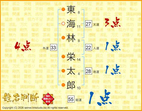 東(8画)海(11画)林(8画) 栄(14画)太(4画)郎(10画)