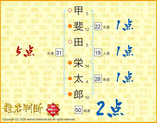 甲(5画)斐(12画)田(5画) 栄(14画)太(4画)郎(10画)
