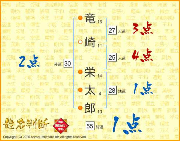 竜(16画)崎(11画) 栄(14画)太(4画)郎(10画)