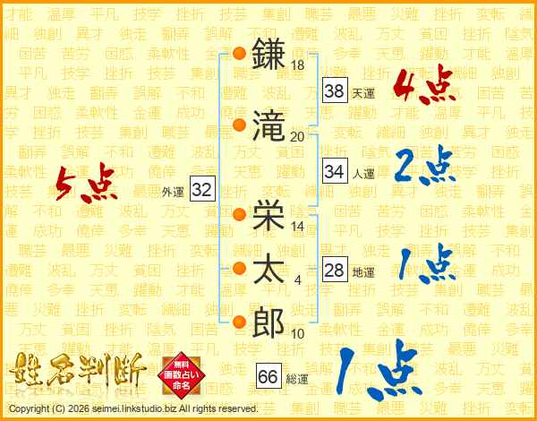 鎌(18画)滝(20画) 栄(14画)太(4画)郎(10画)