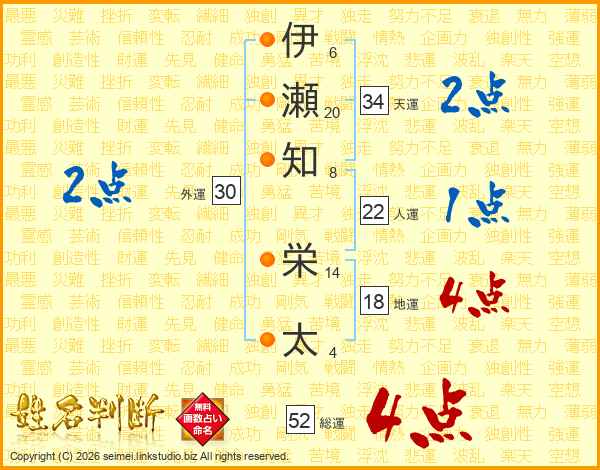 伊瀬知栄太さんの総運は52画の4点!