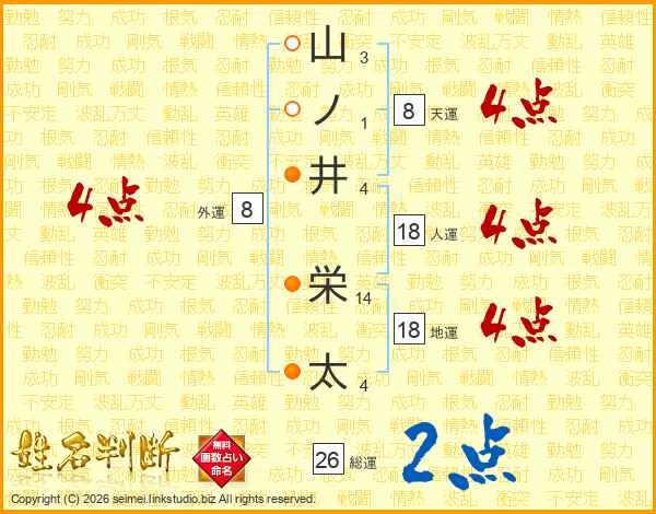 山(3画)ノ(1画)井(4画) 栄(14画)太(4画)