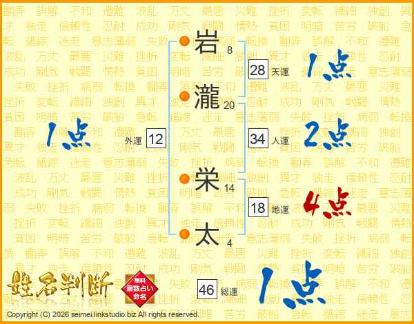 岩(8画)瀧(20画) 栄(14画)太(4画)