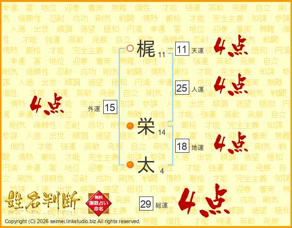 家系が持つ宿命的な運勢を表します。祖先から受け継いだ苗字ですので自分の力が及びません。家柄を象徴します。苗字の合計画数。