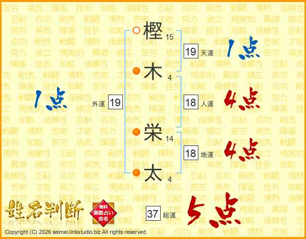 樫(15画)木(4画) 栄(14画)太(4画)