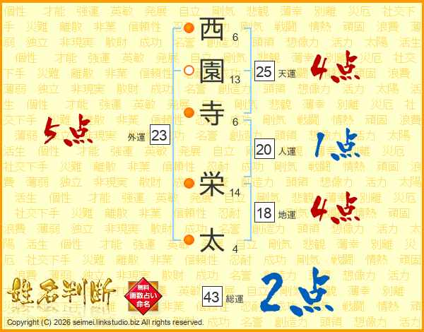 西(6画)園(13画)寺(6画) 栄(14画)太(4画)