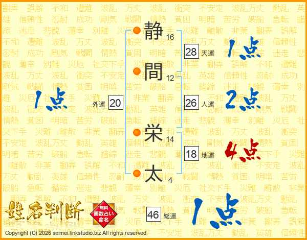 静(16画)間(12画) 栄(14画)太(4画)
