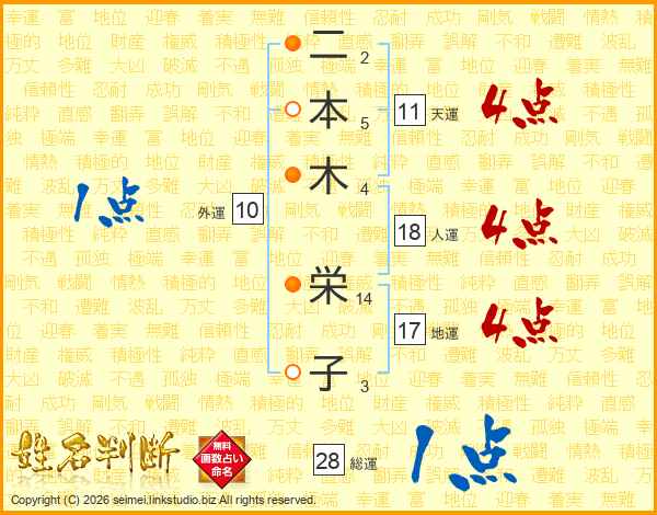二(2画)本(5画)木(4画) 栄(14画)子(3画)