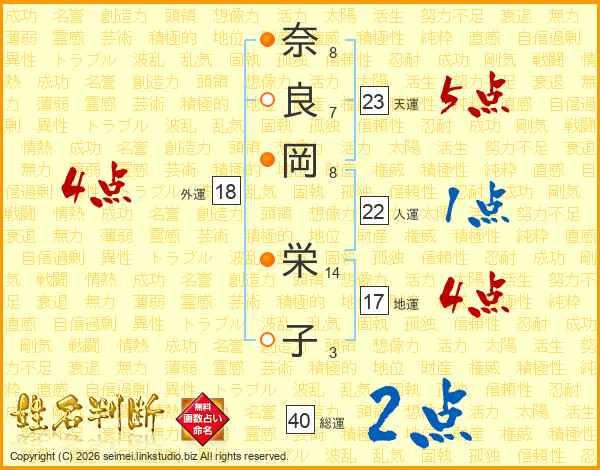 奈(8画)良(7画)岡(8画) 栄(14画)子(3画)