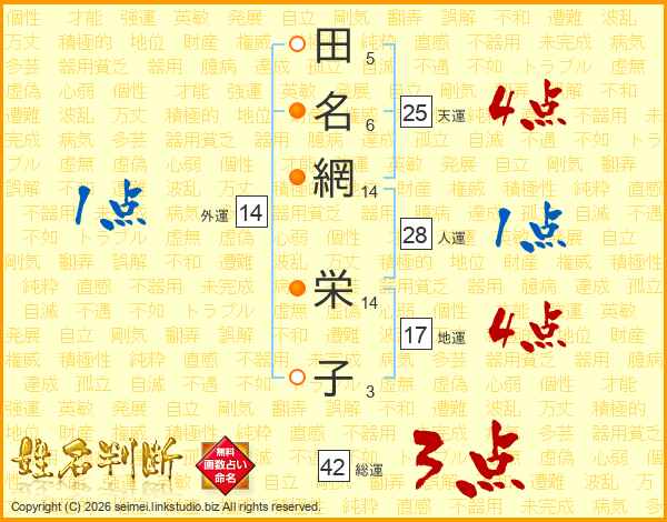 田(5画)名(6画)網(14画) 栄(14画)子(3画)
