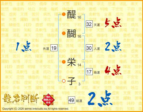 醍(16画)醐(16画) 栄(14画)子(3画)