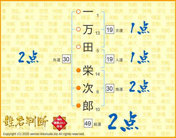 一(1画)万(13画)田(5画) 栄(14画)次(6画)郎(10画)
