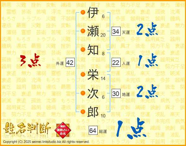 伊(6画)瀬(20画)知(8画) 栄(14画)次(6画)郎(10画)