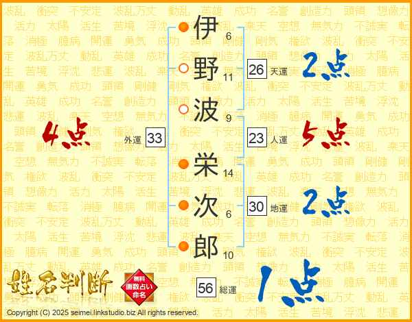 伊(6画)野(11画)波(9画) 栄(14画)次(6画)郎(10画)